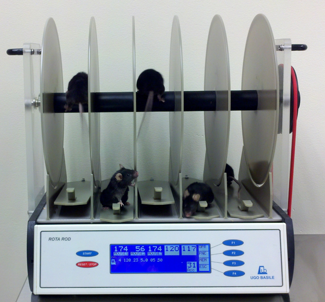 Rotarod: The rotarod is a technique that has been used for decades to test motor performance in mice and rats. Researchers place the animal on a rotating cylinder and record how long it takes for the animals to fall off as the rotation speed is gradually increased. The higher the mouse/rat’s motor performance, the longer they will be able to stay on.